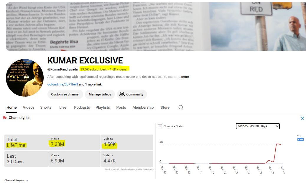 Through his website, kumarexclusive.com, and his YouTube channel, Kumar shares his personal journey from India to America, emphasizing a mission to raise awareness about unethical practices in the IT industry, such as visa abuse by “desi” consulting firms and caste-based hiring networks.