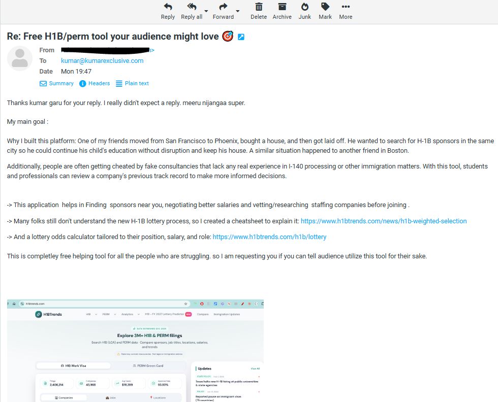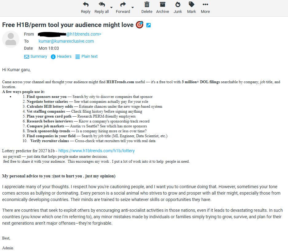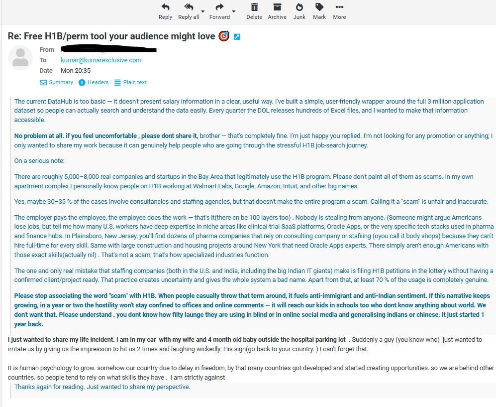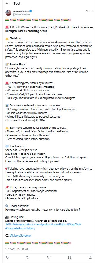 Regarding the H-1B system, the sad reality is that the level of fraud is so high that the moment a U.S. citizen applies for a job, they are rejected — simply because the initial HR screener is Indian, and the application never moves beyond that stage. Also, if the job posting shows recruiters with names like [redacted], Priya, or Shital, a U.S. citizen will often be eliminated immediately. The perception is that the H-1B network controls everything — from HR screening to interviews, and eventually who gets hired. One example shared was of an Indian wife who allegedly used fraudulent experience and had been fired from [redacted] three or four times, but still ended up getting a full-time job once her husband became a full-time employee at the same company. That is the level of fraud people believe is happening under the H-1B system. According to the follower, if the applicant is a U.S. citizen and the hiring team is Indian, they feel they have no chance of being hired.” — A follower sent this information to Kumar Exclusive. Disclaimer: The statements above were sent anonymously by a follower and reflect their personal account and perceptions. These claims have not been independently verified. No specific individual or company is being accused of wrongdoing. All parties are presumed lawful unless proven otherwise by official investigation. This content is for public awareness and discussion, not to promote hate or target any community or nationality. — Kumar Exclusive