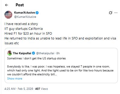 , I am not commenting on any specific videos. Instead, I’m sharing inputs sent by my followers and stories documented on my blog about housing realities faced by many newcomers. kumarexclusive.com/for-internatio A common pattern shared by followers: the more people share a room or apartment, the lower the rent—often out of necessity, not choice. These images reflect how an empty room is later used to accommodate multiple people trying to manage high rents, deposits, and living costs after arriving in the U.S. Sharing realities helps people prepare better, not feel judged. Disclaimer: This post is shared strictly for public awareness. It is not meant to expose, shame, or target F-1 international students, H-1B workers, or any immigrant community. The intent is to document lived realities, highlight cost-of-living pressures, and help new arrivals set realistic expectations. All information shared here is based on voluntary follower inputs and publicly shared experiences. https://x.com/KumarXclusive/status/2015558803861696526?s=20