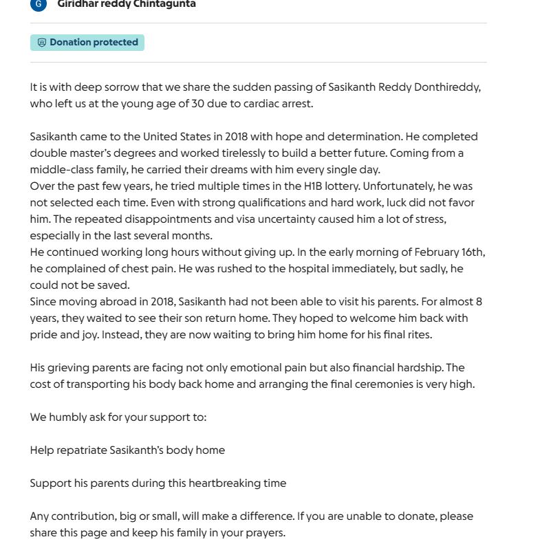 ⚠️ Note: Details about visa stress, immigration status, and personal circumstances are based on the fundraiser narrative and media reports. No official U.S. medical or investigative report has been publicly released at this time.