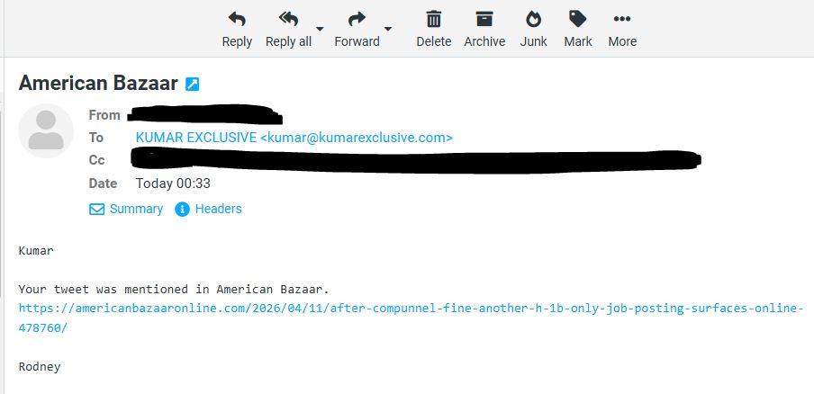 (Kumar Exclusive), primarily focused on H-1B visa fraud exposure, whistleblowing, and related issues. However, based on available data, it contains limited detailed content—mostly links, PDFs, or references to your contributions rather than a comprehensive list of embedded articles, full quotes, dates, or summaries. It highlights your efforts in raising awareness about visa abuses, “desi” consulting company practices, caste-based media conflicts, and exploitation in the U.S. immigration system, but lacks specifics like publication titles, direct embeds, or tonal breakdowns beyond self-described positive/advocacy framing.Media Reports and Coverage (From Public Sources)Mainstream or notable media mentions of you/@KumarXclusive