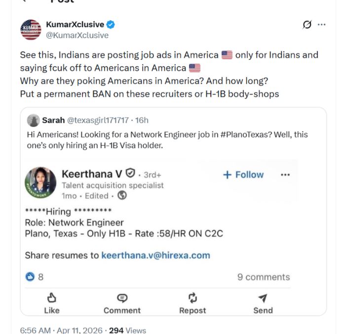 “Reply_intensity”: “Moderate (engagements defending H-1B/Indian talent)”,