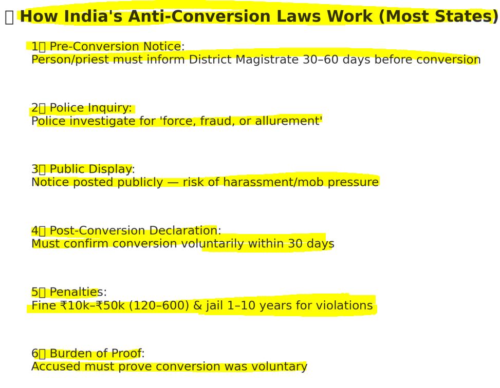 2) Why the hostility? (common drivers) • “Forced conversion” allegations used by vigilante groups to justify intimidation. • State anti‑conversion laws create fear and flip the burden of proof onto the accused. • Local disputes (land/prayer halls), social media rumor-mills, and partisan rhetoric amplify conflict.